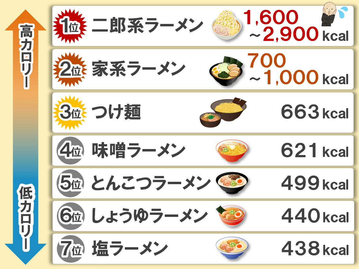 迷った時の参考に、主なラーメンのカロリーを比べてみましょう。