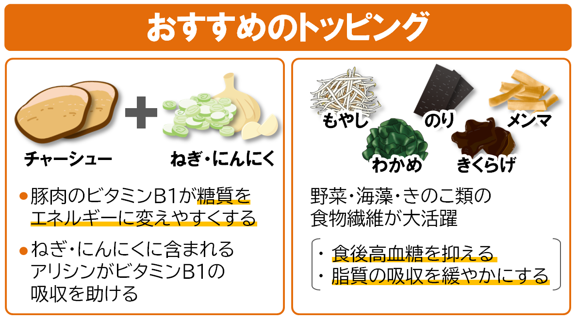 トッピングをすると、栄養バランスが整うと同時に、血糖値やコレステロール値の改善にもつながります。