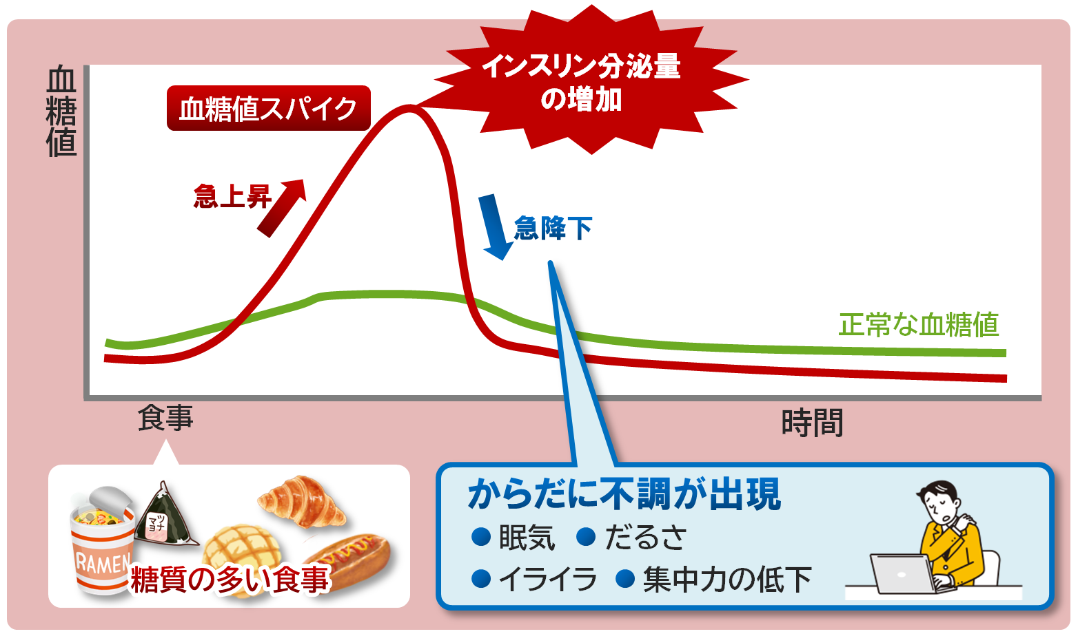 食後の眠気やだるさの一因となるのが「血糖値スパイク」――血糖値が急上昇したあと急激に下がる現象を指します。