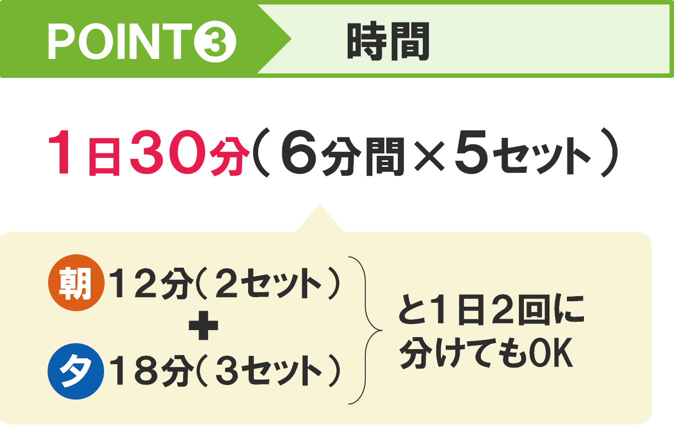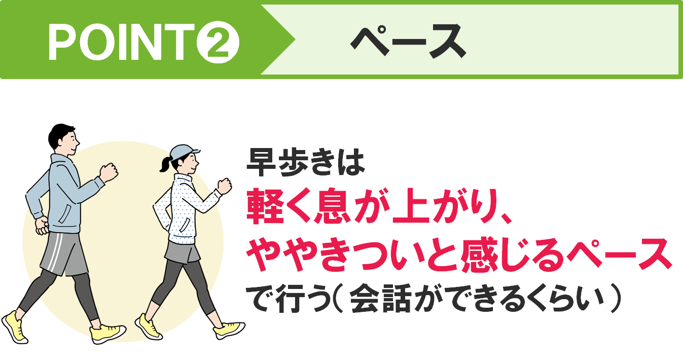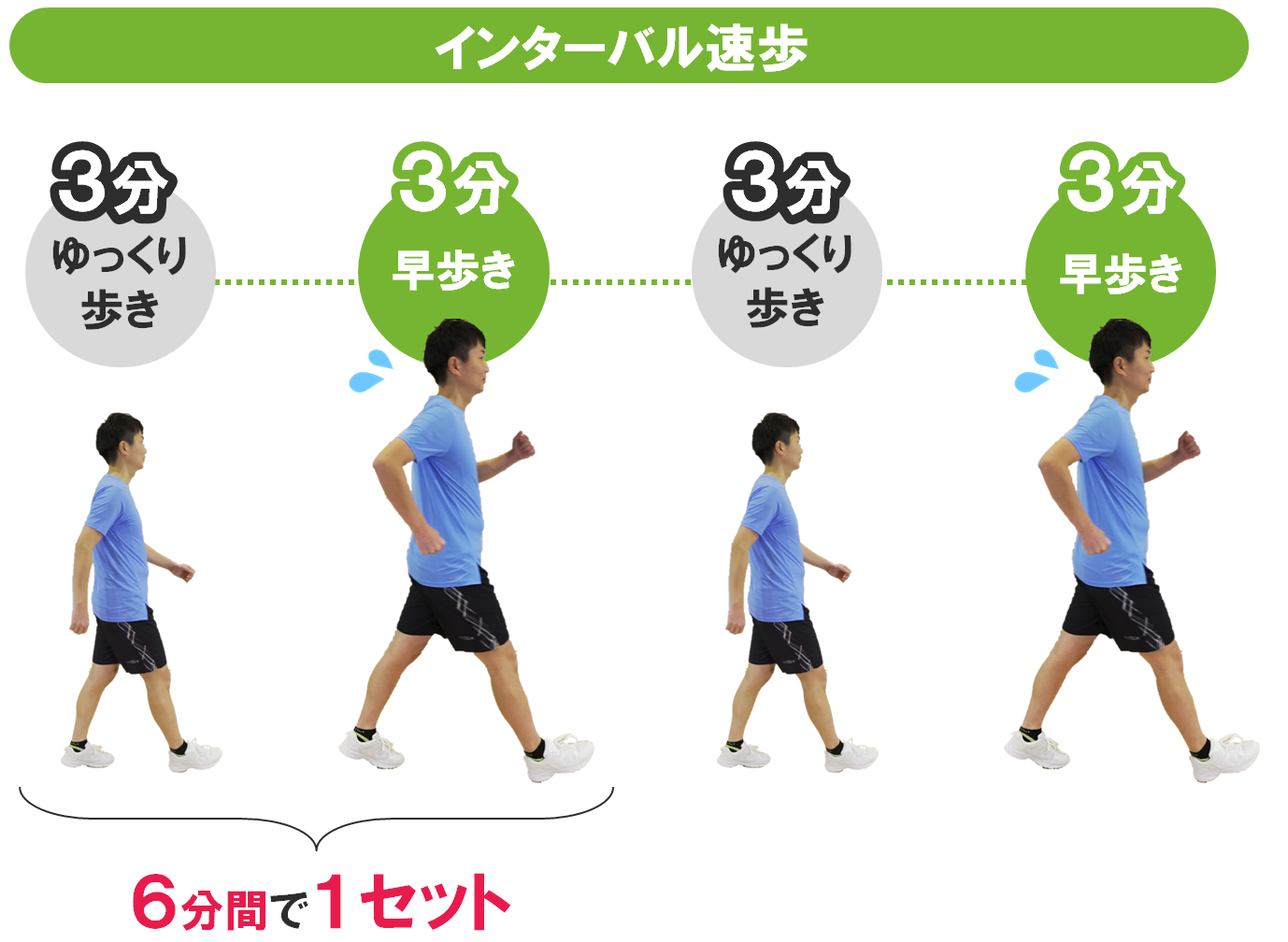 14194【経年用】インターバル速歩(共通) 15 歩数 2025.08.26 インターバル速歩とは、筋肉への負荷が少ない「ゆっくり歩き」と 筋肉に負荷をかける「早歩き」を3分ずつ交互に行う歩き方です。筋力や持久力の向上、肥満解消や検査数値の改善にも効果的です。 ※下記に該当する方は、必要に応じて医療機関を受診するなど、運動前の健康チェックを行い、安心・安全に運動を進めてください。 【血圧】診察時180/110mmHg以上、家庭測定時160/100mmHg以上 【血糖】空腹時血糖250㎎/dl以上 【その他】運動の影響で作用が強まる薬を服用中、運動で悪化する可能性がある整形外科的な不調がある インターバル速歩の3つのポイント インターバル速歩のメリット 30分以上のインターバル速歩を週4日、5か月間継続すると収縮期血圧は10mmHg、拡張期血圧は5mmHg低下するといわれています。