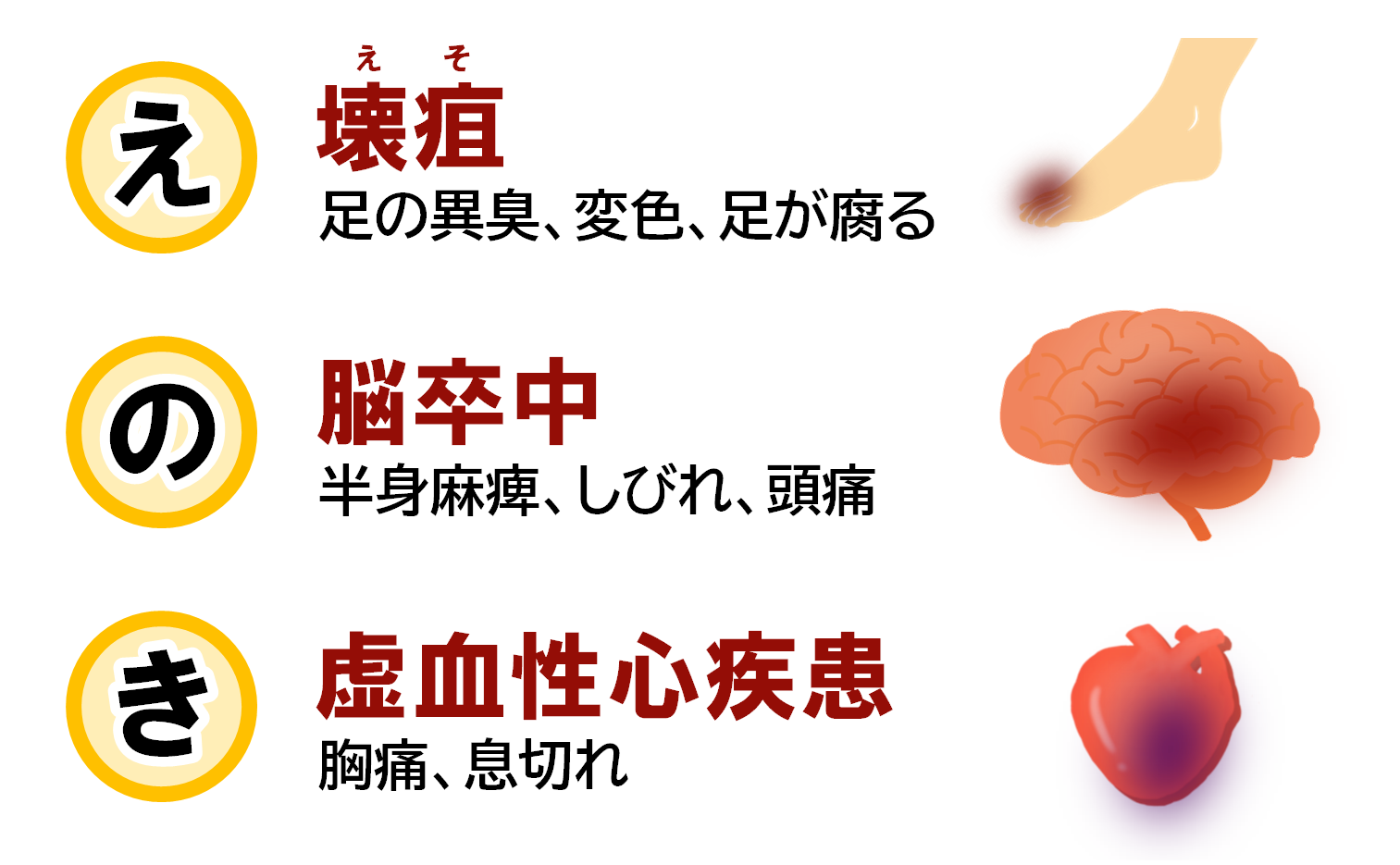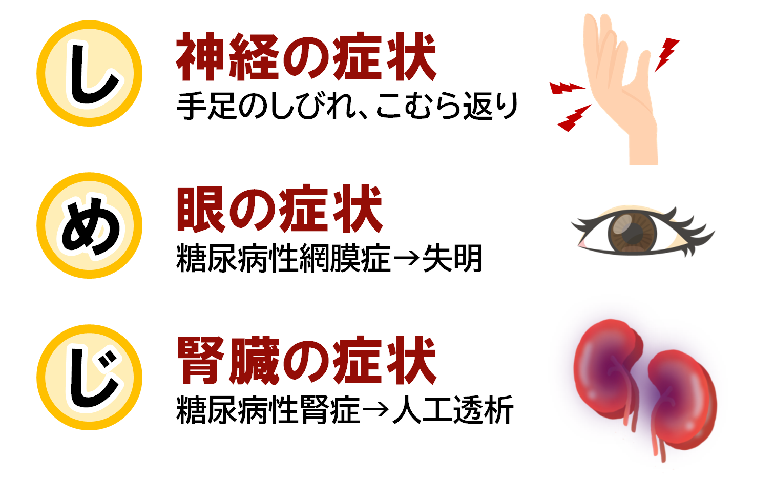 高血糖状態が続くと、血管がもろくなり、全身の血管や神経に様々な障害を引き起こします。