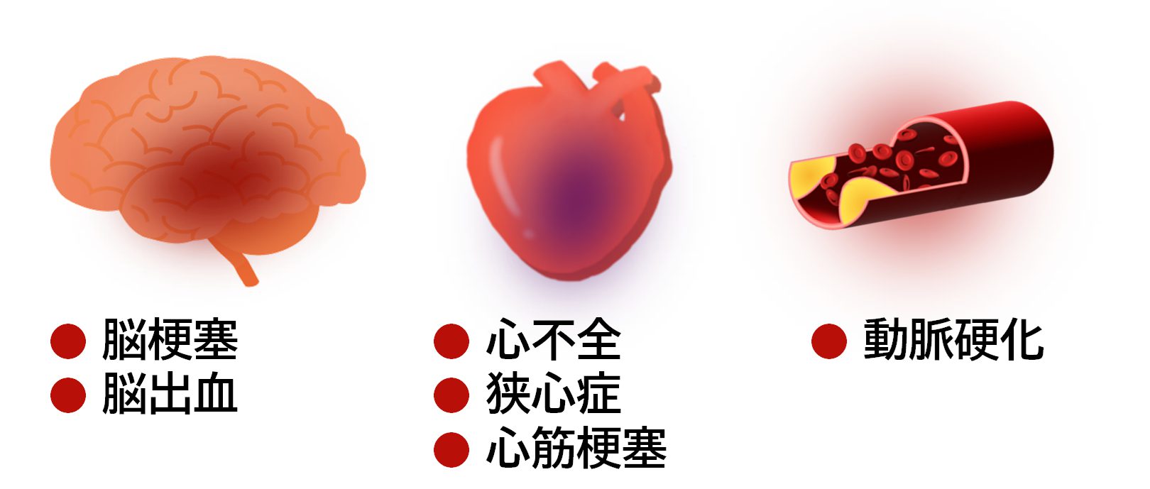 血中脂質が基準値を超え余分な脂が血管壁にたまることで、動脈硬化・脳梗塞などの生命を脅かす病気を引き起こします。
