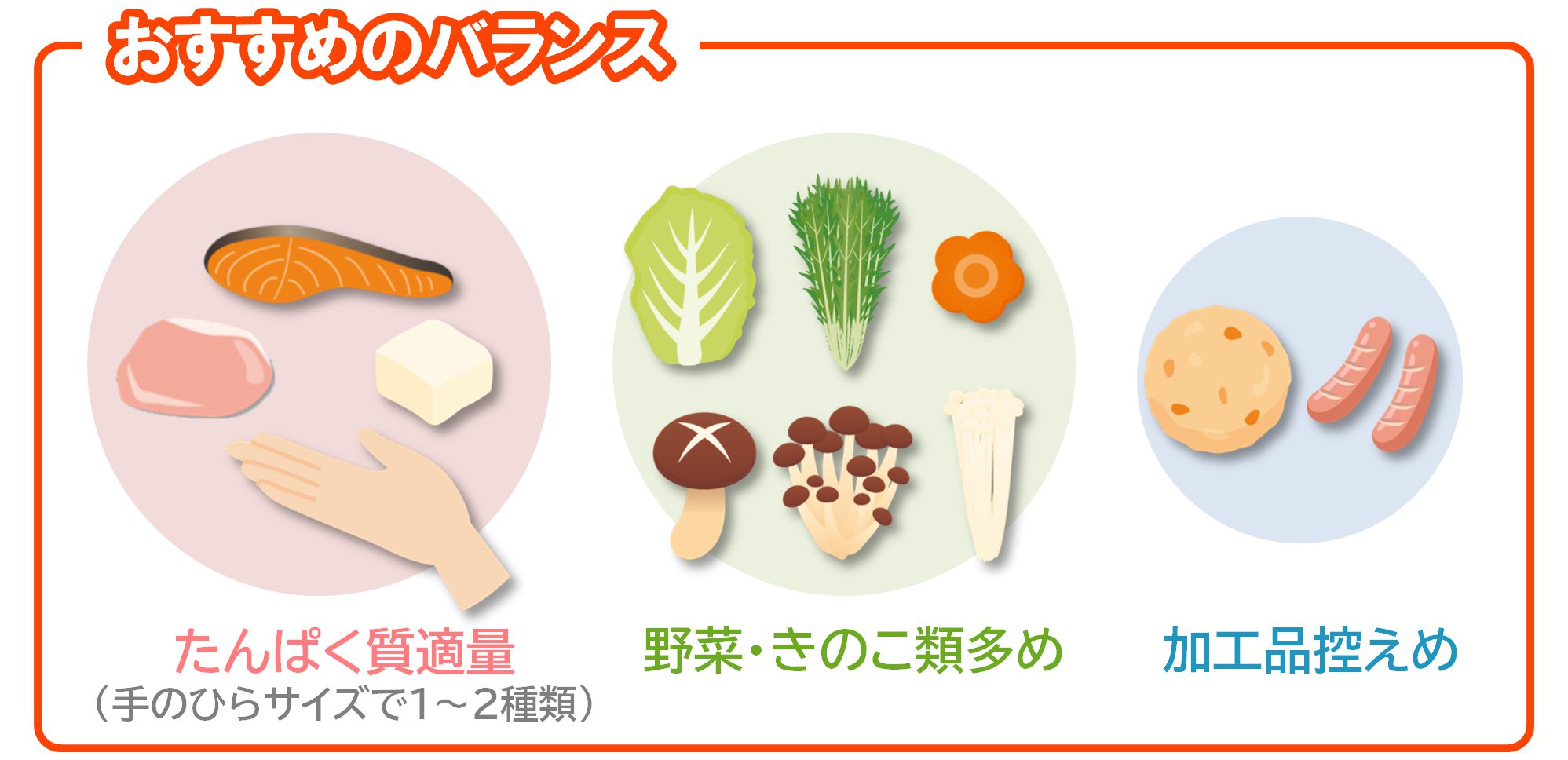 習慣① 野菜多め・たんぱく質適量・加工品控えめに