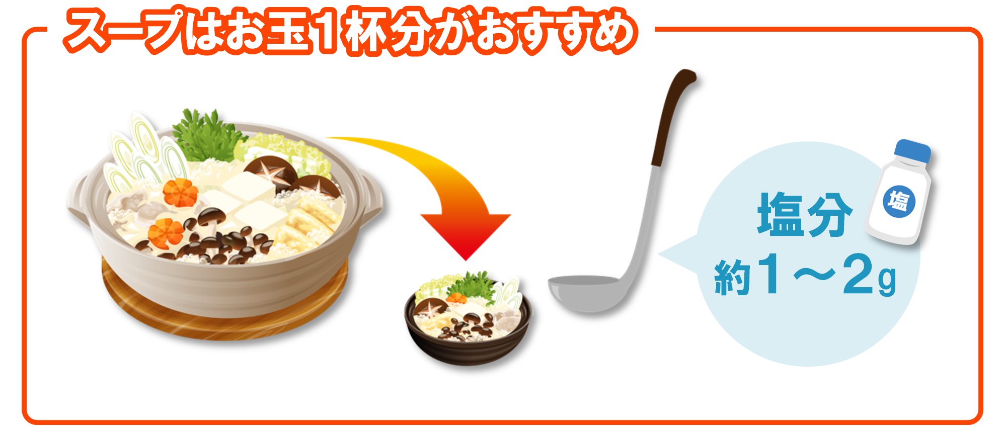 - スープは お玉1杯で約1〜2gの塩分 を含む(高血圧の人は塩分6g未満/日が目安)