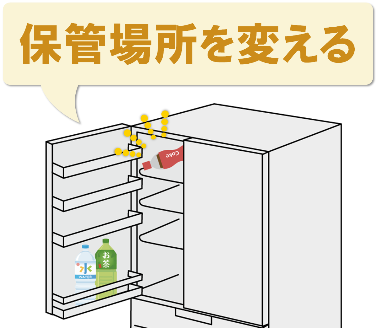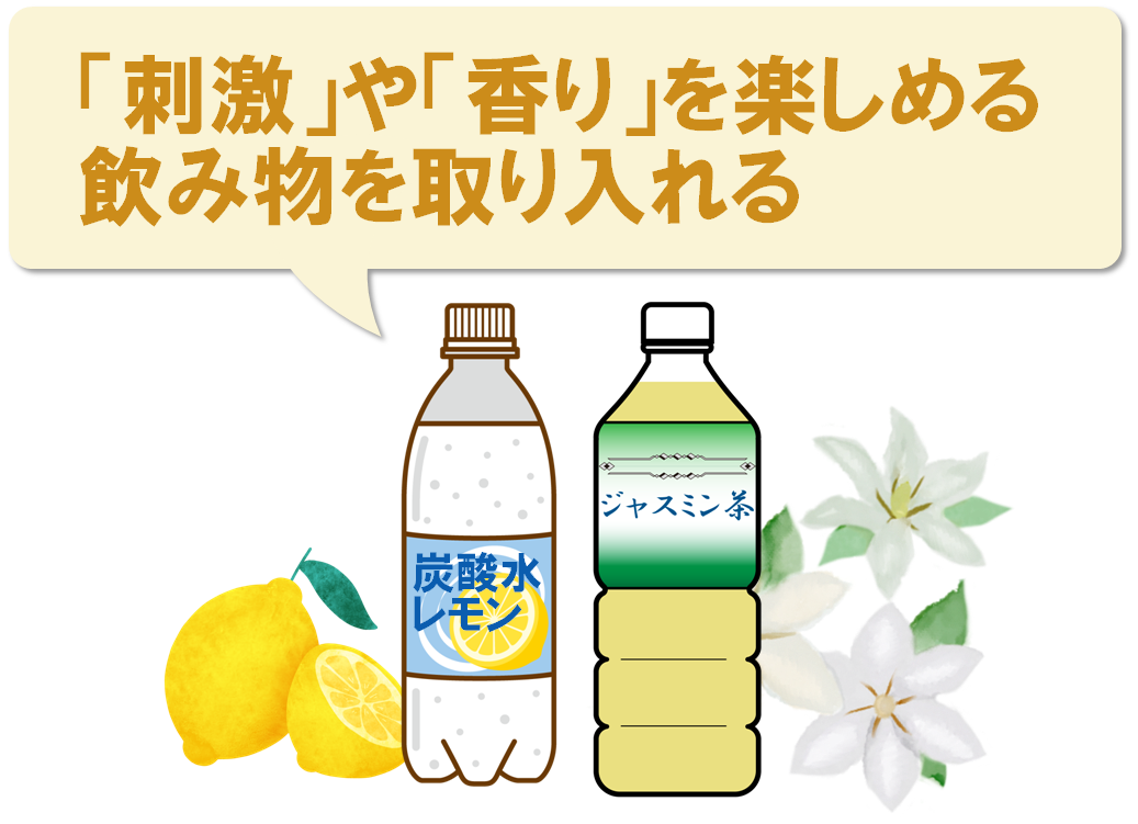 お茶や無糖の炭酸水などを手前に置き、ジュース類は奥にしまっておくのがおすすめです(=刺激統制法)。
