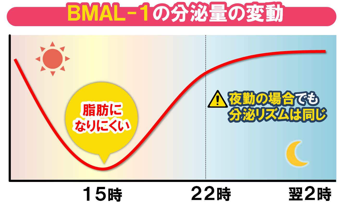 脂肪をためるたんぱく質「BMAL-1(ビーマルワン)」は15時頃に最も少なく、夜に向かって増加します。そのため、間食をするなら脂肪になりにくい15時頃がおすすめです。