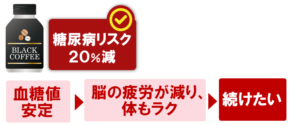 ブラックコーヒーは1日2〜3杯で糖尿病リスクを約20%下げる効果があると言われています。