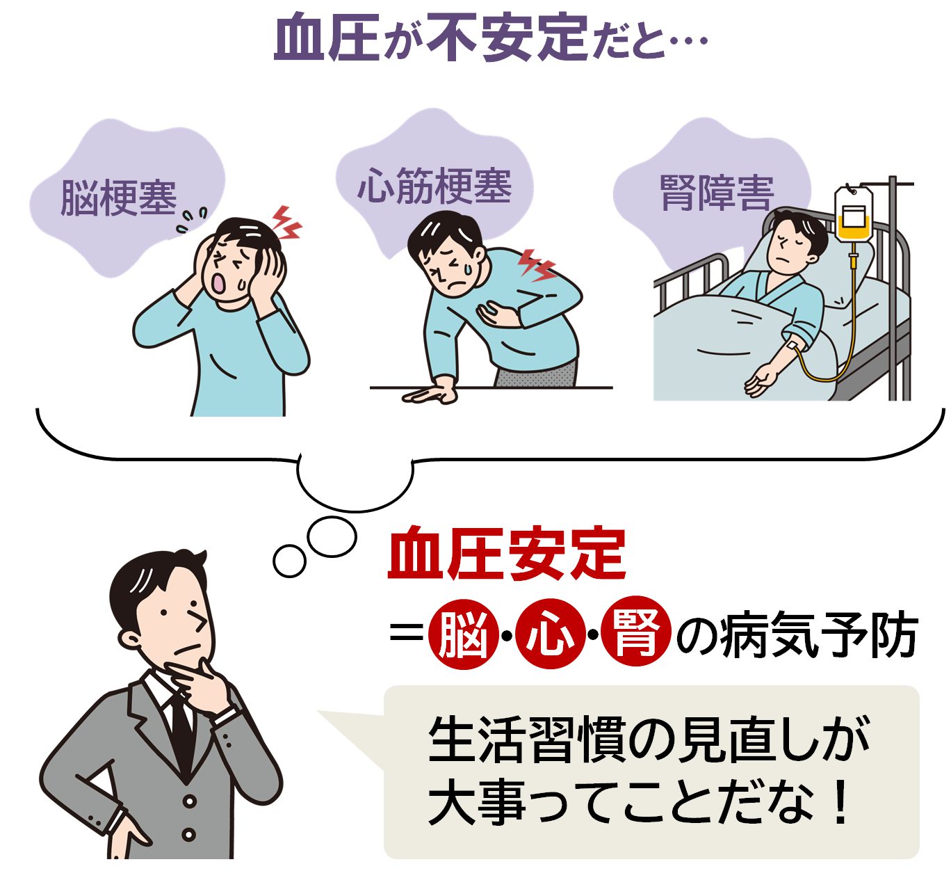 血圧が安定すると血管が傷つきにくくなり、脳梗塞や心筋梗塞などの予防につながります。