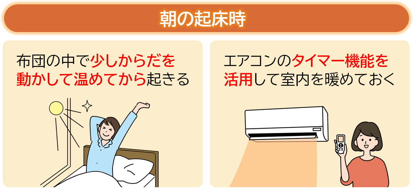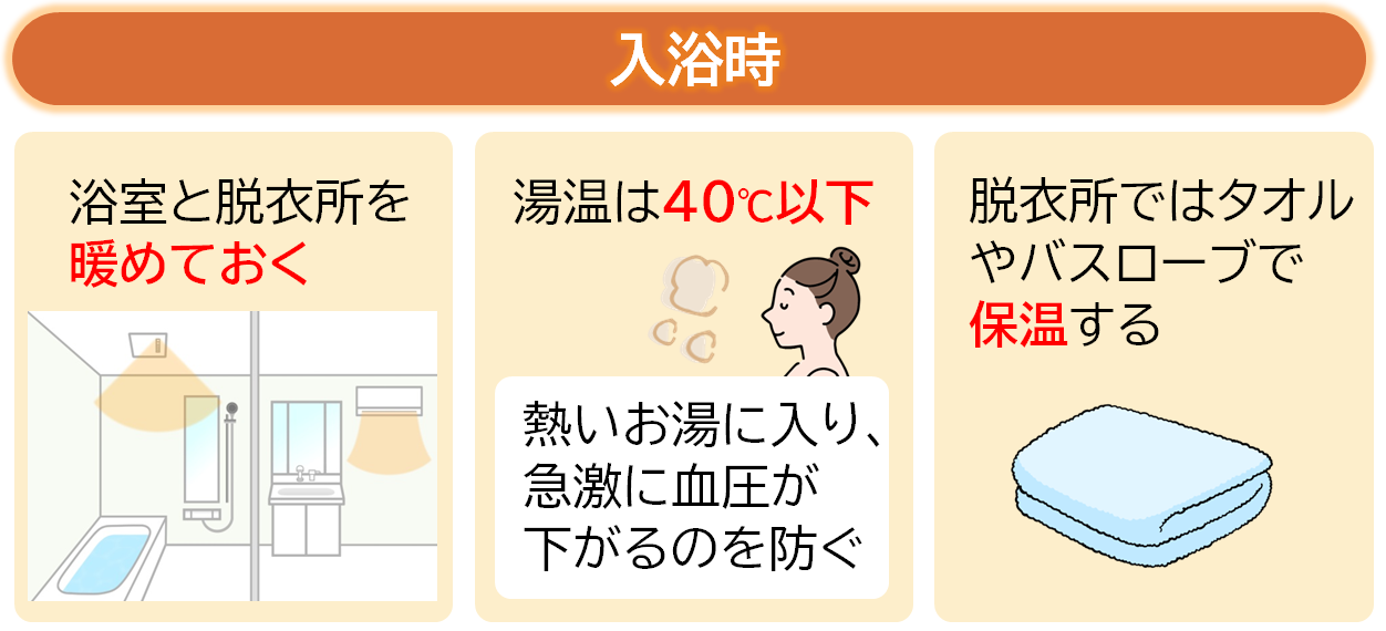 血圧が急上昇しやすいのは、暖かい場所から寒い場所へ移動する際(外出時・入浴時など)です。急激な温度変化への対策をとっておくと安心です。