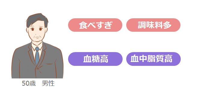 デスクワーク中心。平日は通勤で往復1時間歩いており、週末はジムでの運動習慣あり。食事面は、妻が毎晩必ずサラダを出してくれていますが、マヨネーズやドレッシングの量は気にしておらず、食後お皿に残るくらいたっぷりかけていました。